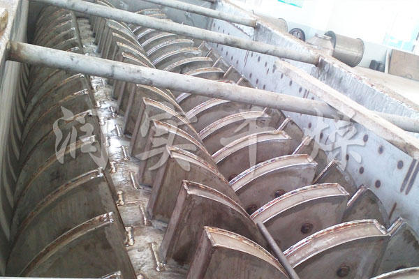 空心軸上密集排列著楔型中空漿葉,熱介質經空心軸流經漿葉。單位有效容積內傳熱面積很大,熱介質溫度從-40℃到320℃,可以是水蒸汽,也可以是液體型:如熱水、導熱油等。間接傳導加熱,沒有攜帶空氣帶走熱量,熱量均用來加熱物料。熱量損失僅為通過器體保溫層向環境的散熱。楔型漿葉傳熱面具有自清潔功能。物料顆粒與楔型面的相對運動產生洗刷作用,能夠洗刷掉楔型面上附著物料,使運轉中一直保持著清潔的傳熱面。漿葉干燥機的殼體為Ω型,殼體內一般安排二到四根空心攪拌軸。殼體有密封端蓋與上蓋,防止物料粉塵外泄而充分發揮作用。